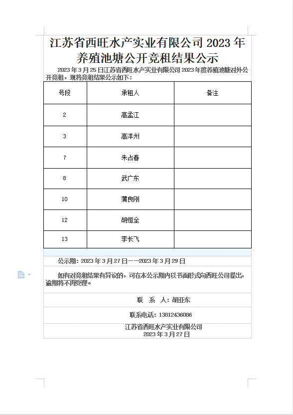 江蘇省西旺水產實業有限公司2023年養殖池塘公開競租結果公示